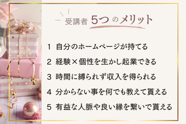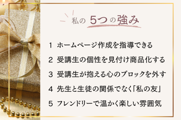 | ある受講生のお話・・・ 自分の抱えていた内面やブロックを外し、心に正直なホームページを作り上げました。すると完成直後から県庁、ラジオ出演、テレビ、公民館、地元のお店や多方面から「ぜひ講義をして欲しい」そんな嬉しいお申込みがあったと。お客様にこう言われたそうです「あなたのサイトは決して完成度は高くない。でも、そこじゃなく、あなたの人間性がとても伝わってくるんです。この人にお願いしたい。そう思ったから」と。その報告を受けた時は涙が出るほど嬉しかったです。 |